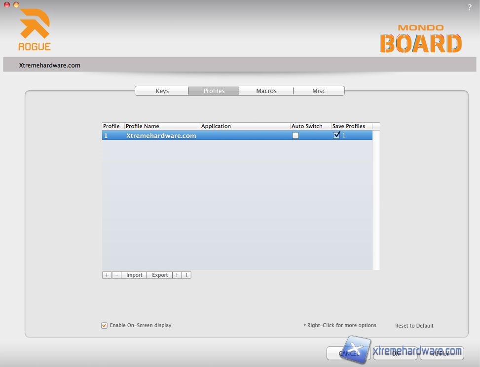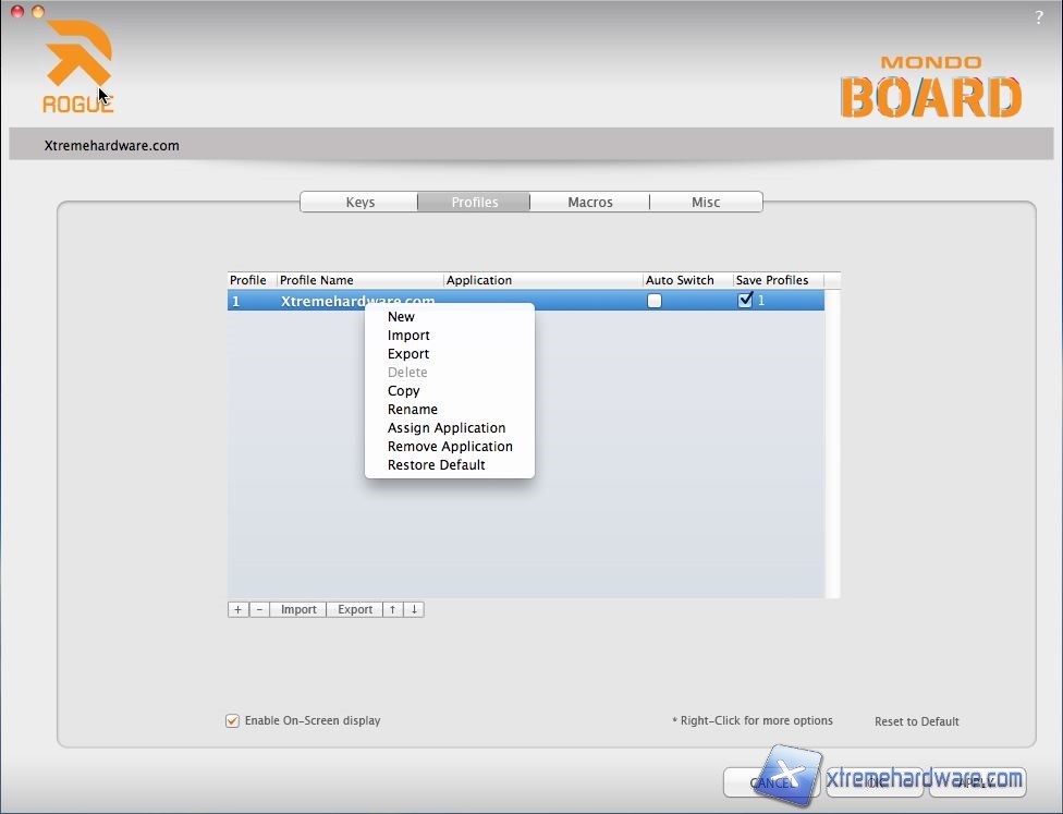 Passando al menù successivo chiamato “Profiles” qui abbiamo la possibilità di creare, modificare, cancellare, importare o esportare tutti i profili che creeremo. I profili possono essere caricati all’occorrenza tramite l’assegnazione di un qualsiasi tasto sulla tastiera. Ricordiamo che la Rogue Mondo Board ha non solo un processore a 32bit ARM in grado di pilotare ogni funzione della tastiera ma è presente anche una comoda memoria on-board da 256KB che ci permetterà di creare abbastanza profili per ogni nostra esigenza.