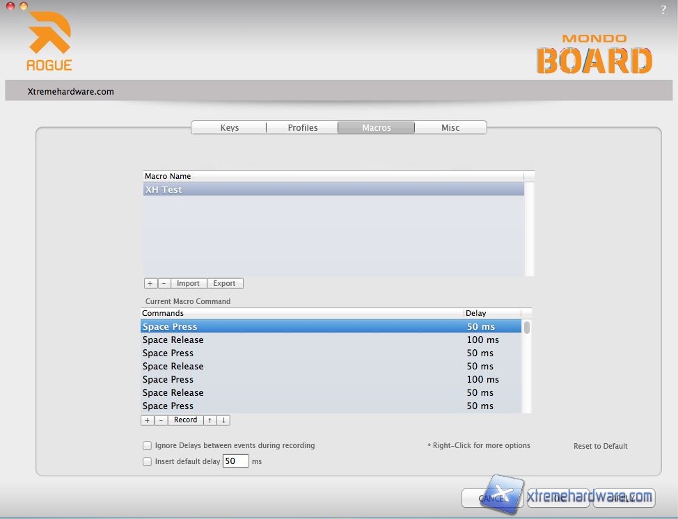 Installato il software sul nostro Mac ed avviato ci troviamo di fronte ad una grafica pulita ed essenziale che richiama il design della tastiera stessa. Il software si compone di quattro Menù che ora andremo ad analizzare. Partendo dal primo, chiamato “Keys”, troviamo un’immagine della tastiera e sotto le funzioni che possiamo assegnare ad ogni tasto. Per fare ciò, ci basterà cliccare un tasto qualunque ed attendere che inizi a lampeggiare di verde. Fatto ciò, cliccando sulle icone presenti sotto la voce Assign Function, potremo assegnare a quel dato tasto una Macro oppure un profilo da caricare o ancora l’esecuzione di un programma. Per la prova abbiamo utilizzato la funzione Macro che ci apre un ulteriore menù dove possiamo caricare la Macro precedentemente creata; in questo caso l’abbiamo chiamata XH Test. Tale funzionalità di creare Macro e gestione delle stesse è possibile ovviamente solo tramite il software in dotazione che ricordiamo al momento essere compatibile soltanto con sistemi Mac, seppur la tastiera funzioni anche su Windows. Per ovvi motivi è facile capire che avremo, installando la tastiera su Windows, solo una parte delle molte funzioni della tastiera come cambiare illuminazione e intensità, tramite la classica pressione del tasto FN+F1/F2, precludendoci la possibilità di utilizzare i tasti “G” programmabili.