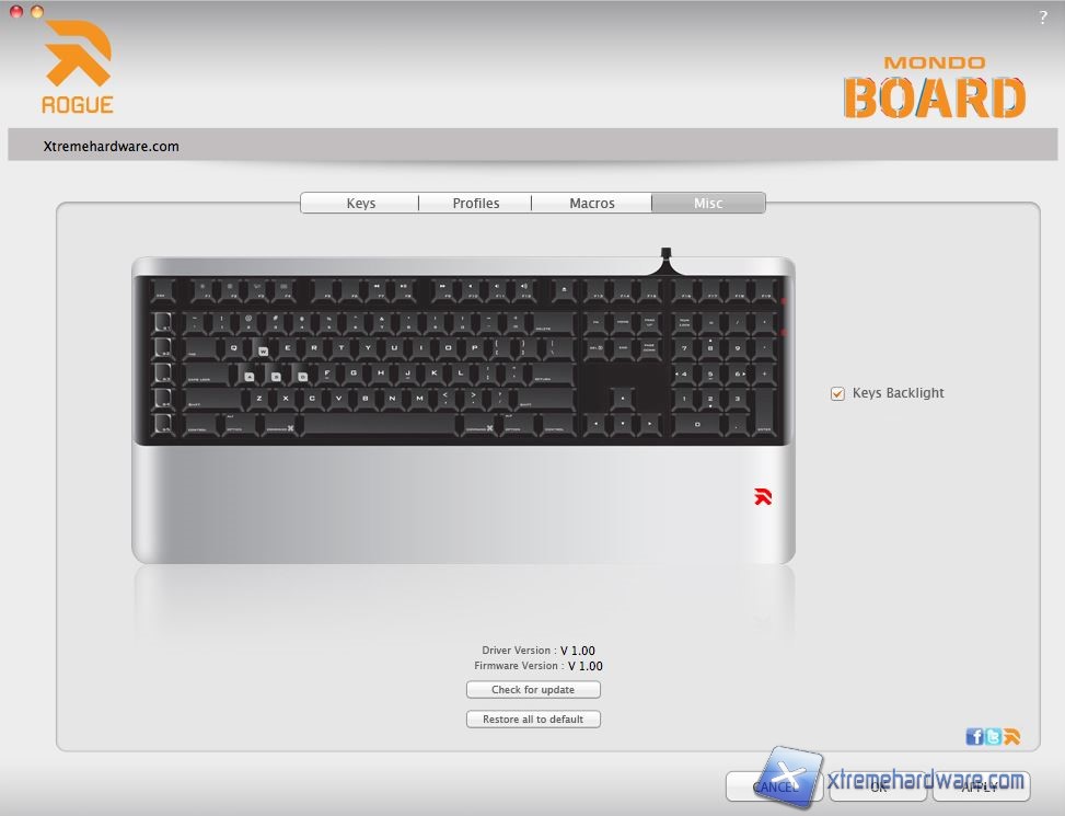 A corredo della Mondo Board non viene fornito nessun CD-ROM con il software per la gestione della tastiera, ma ci basterà collegarci al sito della Rogue e scaricare il software di gestione che ci permetterà di controllare e personalizzare tutte le funzionalità della tastiera in particolar modo l’illuminazione ed i tasti Macro.
