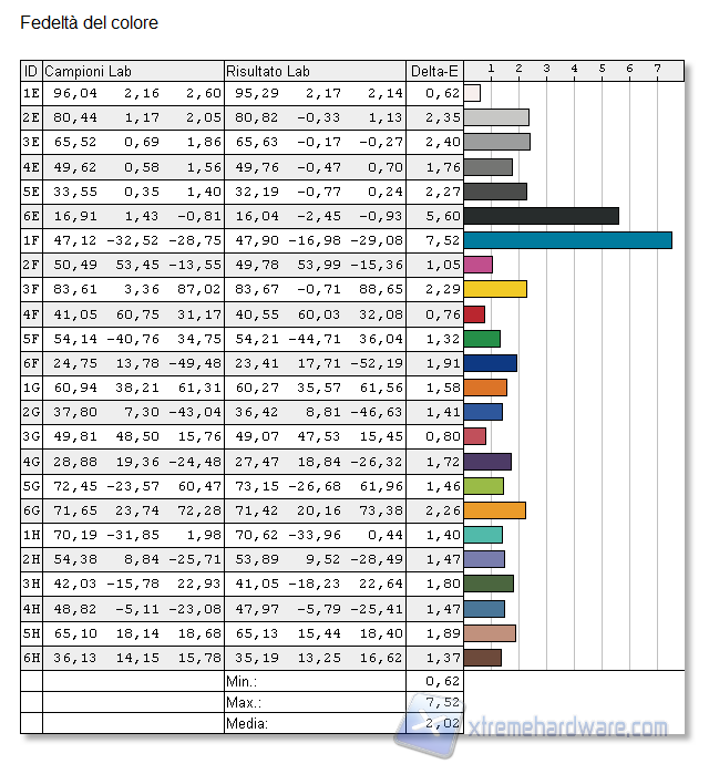 Per quanto riguarda la fedeltà cromatica, il monitor fa registrare, come valore del Delta-E, una media di 2. Il numero indica la distanza tra la riproduzione di una tonalità data dal monitor e quella esatta. Potremmo riassumere una scala di giudizio secondo quanto segue: