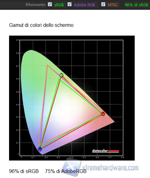 Con queste impostazioni e con il profilo colorimetrico creato dalla sonda Datacolor Spyder4, il BenQ XL2420T è stato in grado di ricoprire il 96% dello spazio colore sRGB e il 75% di quello AdobeRGB.